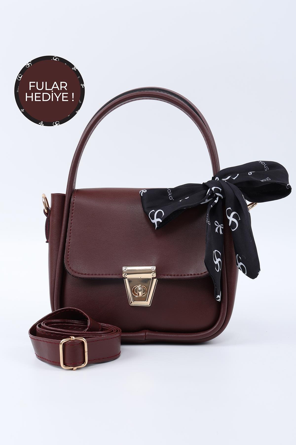 Bordo Shk235 Suni Deri Tek Bölmeli Fular Hediyeli El Kol ve Omuz Çantası