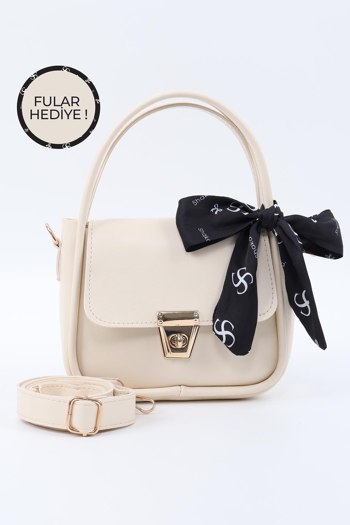 Krem Shk235 Suni Deri Tek Bölmeli Fular Hediyeli El Kol ve Omuz Çantası