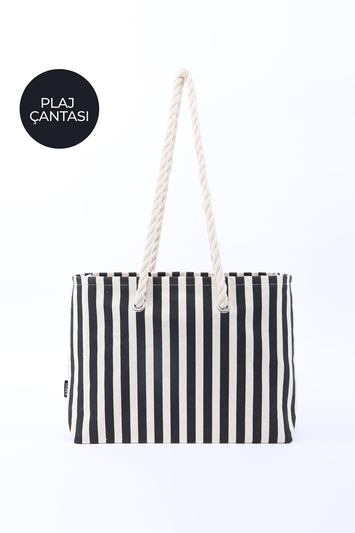 Siyah Shk234 Kanvas Kumaş Tek Bölmeli Çizgi Desenli Seyahat, Piknik ve Plaj Çantası